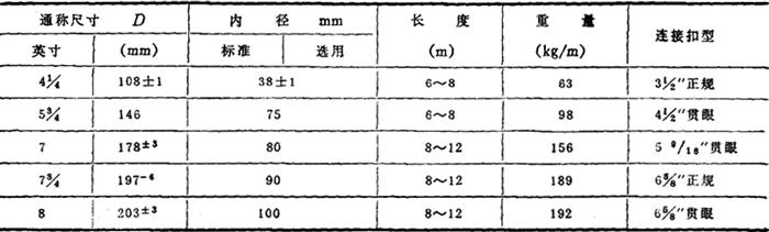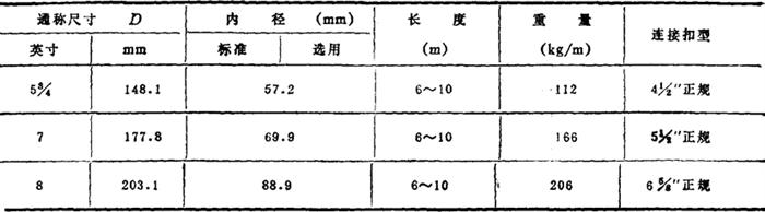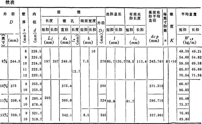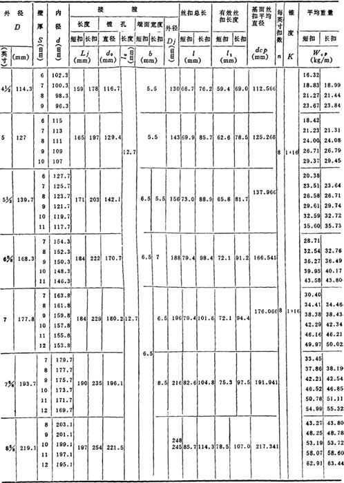 注:(1)平均重量即带接箍之重量,按每10m-个接箍计算。 (2)表中缺空,表示无此种规范的套管。 (3)长接箍的套管最大只有