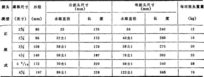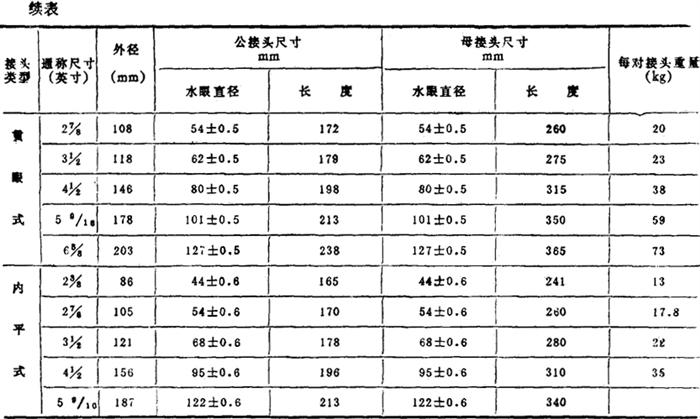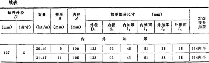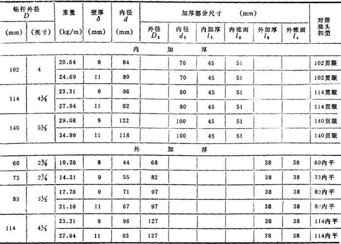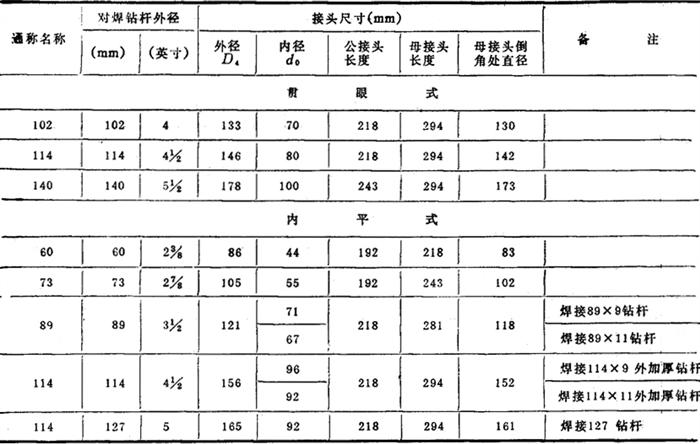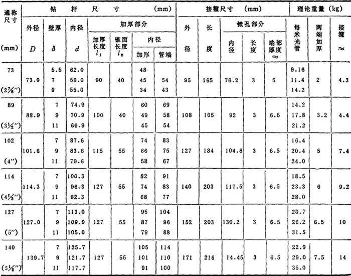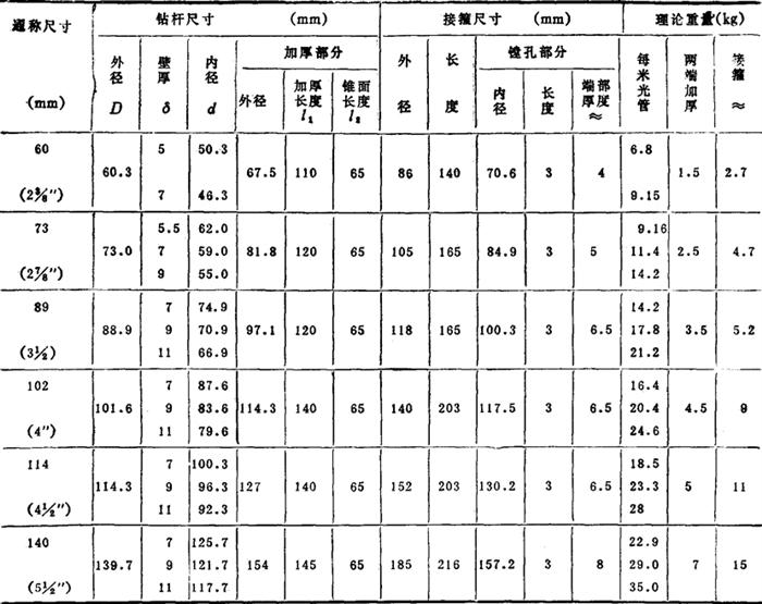 注:重量系管体每米重量. 表3-2-55 国产对焊钻杆接头规范(YB691-70)