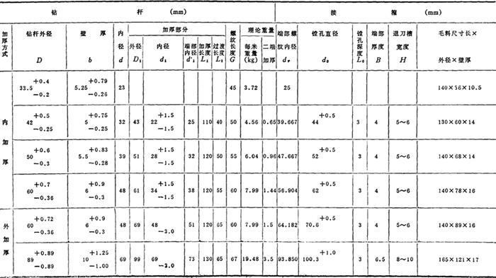 注:重量系管体每米重量。 表3-2-54 国产对焊钻杆加厚端尺寸(YB691-70)
