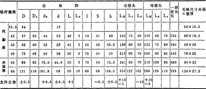 注:(1)锥面长度l2供参考. (2)加厚部分内径与管端可以相等. (3)外径139.7mm的管子,其加厚部分外径不得大于141.3mm. 表3-2-58 国产细扣外加厚钻杆规范(YB528-65)