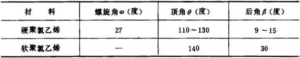 实践证明,钻头的螺旋角越小,越不易导屑,越易产生胶着或烧焦;钻头的顶角越大,越易使孔边开裂。因塑料的性能不同,钻头的参数也有差异(表9-1-13)。