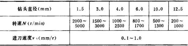 因硬聚氯乙烯在钻孔处具有很大的线膨胀系数,所以,选择钻头直径时,应略大于规定的孔径(约大0.05mm)。在钻削时,应经常提起钻头,以清理切屑。转速应随钻头的直径而变化(表9-1-14)。