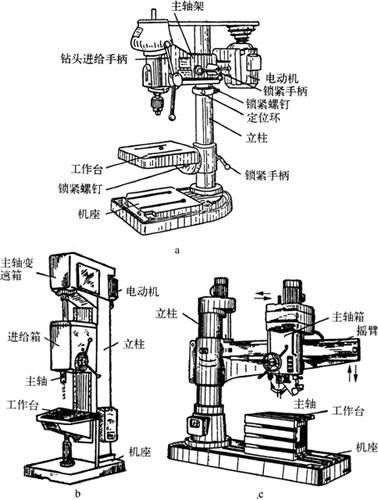 图3-19 各式钻床 a.台式钻床 b.立式钻床 c.摇臂钻床 台式钻床的主轴转速一般较高,最高转速接近每分钟万转,可通过改变三角胶带在塔形带轮上的位置来调节。主轴进给是手动的,为适应不同工件尺寸的要求,在松开锁紧手柄后,主轴架可以沿立柱上下移动。 (2)立式钻床:立式钻床简称立钻(图3-19b)。其最大钻孔直径有25mm、35mm、40mm、50mm等几种,其规格用最大钻孔直径表示。 立钻由电动机经带轮传递给主轴转动,并通过主轴变速箱获得需要的各种转速,一般钻小孔选用较高转速,钻大孔选用较低转速。主轴是在主轴套筒内作旋转运动,同时通过进给箱驱动主轴套筒作直线运动,从而使主轴一边旋转,一边随主轴套筒按所选的进给量,自动作轴向进给,也可用手柄实现手动轴向进给。 进给箱和工作台可沿立柱上的导轨调整上下位置,以适应不同高度工件的加工。 立钻的主轴不能在垂直其轴线的平面内移动,钻孔时要使钻头与工件孔的中心重合,就必须移动工件。因此,立钻只适于加工中小型工件。 (3)摇臂钻床:图3-19c所示为摇臂钻床,由于其摇臂带着主轴箱可沿立柱垂直移动,同时主轴箱还能在摇臂上作横向移动,所以再移动钻床主轴箱,便可将钻头位置对准被加工孔的中心,而不需移动工件便可加工。 因此,摇臂钻加工时工作可固定不动,而钻头转动切削且能随摇臂绕立柱旋转360°,这种钻床广泛应用于加工单件、成批量生产的大型工件和多孔工件。 工件通常安装在工作台上加工,如果工件很大,也可直接放在底座上加工,其最大钻孔直径可达100mm。加工时,根据工件上孔的位置不同,可将主轴左右移动调整到机床加工范围内的任何一个位置,根据工件高度不同,还可将摇臂沿立柱上下移动调整到加工位置,进给时可自动也可手动,但事先要锁紧摇臂及主轴箱,以免加工中由于振动而影响零件加工质量。 2.电钻 电钻是用手直接握持使用的一种钻孔工具,使用灵活,携带方便,场地不受限制,可加工钻床无法加工的工件上特殊部位的孔。 电钻的电源电压为220V或36V,其尺寸规格按所钻最大孔径分为6mm、 10mm、13mm等几种,其结构由电动机、减速装置、钻夹头、手柄和开关等组成,其种类有手枪式和手提式两种,如图3-20所示。