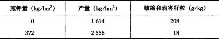 注:蛋白质用半微量滴定法,脂肪用索氏提取法,氨基酸用日立835-30型氨基酸自动分析仪测定。 2.钾对经济作物品质的影响 芥酸含量是评价油菜品质的重要指标之一,含量高的品质差,因为芥酸碳链较长,进入人体后不易被消化吸收。同时芥酸含量会限制营养价值高的油酸和亚油酸含量的提高。据南京农业大学徐光壁等人研究结果表明:施钾量对油酸含量有增加的趋势,对粗蛋白及芥酸含量没有影响(表5-15)。 表5-15 施钾对菜子品质的影响