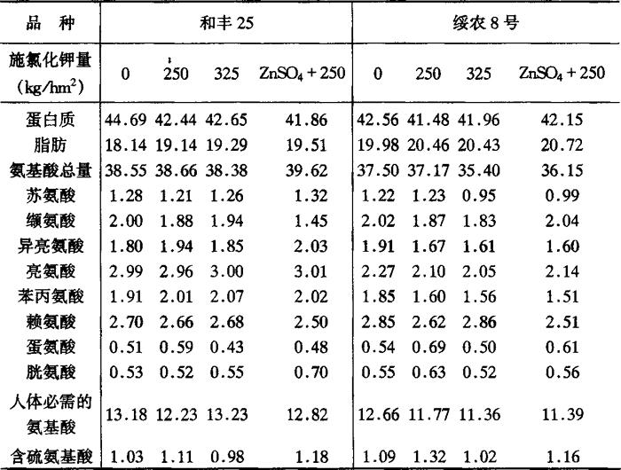 黑龙江省农业科学院李玉颖等人研究钾对大豆品质影响结果表明:施钾肥能提高大豆脂肪含量,对大豆籽粒中氨基酸影响较小,大豆的蛋白质含量是减少的(表5-14)。 表5-14 钾、硫对大豆品质的影响(%)