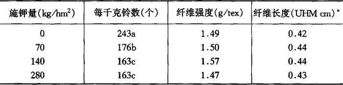 Mengel(1981)等人报道,钾间接影响小麦子粒蛋白质的形成,这是由于钾能促使氨基酸从植株部分向谷粒迁移,从而有利于谷朊(面筋)和醇溶朊的合成。 何成辉等人研究报道,啤酒大麦籽粒中淀粉含量随施钾量增加而增加,蛋白质含量随施钾量增加而减少,二者与施钾量关系均可用渐进线方程表示,即淀粉含量与施钾量: y=53.5-12.4*12.4x r=0.988* *,n=7 蛋白质含量与施钾量的关系为: y=11+13.2*0.565x r=-0.963*,n=4棉花纤维品质的评定,不但要根据纤维的长度、强度、细度,而且要根据纤维的色泽和洁度。施肥技术、栽培技术、气候条件以及品种均影响这些品质参数。钾不仅可使棉铃增大,也可通过增加纤维长度和强度而改善棉花品质。 表5-16 钾对棉花产量和品质的影响