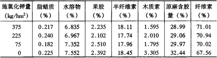 * UHM=上半截平均长度 萱麻是一种喜钾的纤维作物,钾肥在萱麻上的效果很显着。江西农业大学刘桃菊研究施钾对萱麻品质影响结果表明:钾肥能增加原麻纤维含量,单纤维支数与施钾量极显着(r=0.9960* *),钾可以改善纤维品质,这对于麻纺工业提高脱胶效率,增加精麻率尤其重要(表5-17)。 表5-17 钾对原麻化学成分的影响*