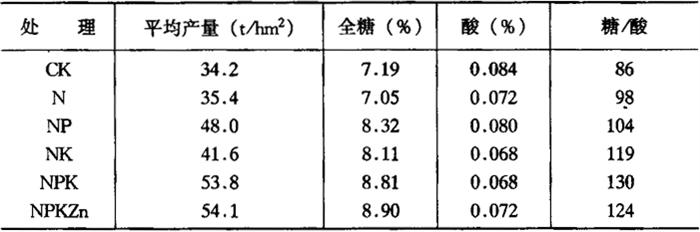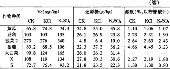 * 原麻化学成分为破秆麻和二麻两季平均。 3.钾对蔬菜水果品质的影响 马铃薯是很容易加工的农产品,加工成的薯片、薯条清脆可口,老少皆宜,市场潜力较大。马铃薯的质量参数不但包括市场销售总量,而且包括它的成熟度、抗病力和商品薯质量。比较均一,色彩明亮的薯片最合乎市场的需要。但是,糖、氨基酸和酪氨酸会使马铃薯薯片色泽变暗,钾的作用可降低这些成分在马铃薯中的含量。钾不足时,磕磕碰碰会使马铃薯块茎色泽变暗,而缺钾不严重的马铃薯,其块茎只在煮熟后才会变色。比重是衡量块茎品质的一个标准,它与马铃薯块茎的淀粉含量、固形物总量以及粉性有关。这些值受品种、土壤理化状况及气候的影响,不过这些标准的商业价值取决于马铃薯的用途,如用作工业生产(如制酒精)原料时需要干物质中淀粉含量较多的马铃薯。 天津市农业科学院周艺敏对喜钾作物如西瓜、大白菜、番茄和芹菜进行大量的研究,结果表明,钾不仅能提高糖的含量,而且能明显降低西瓜的酸度,大幅度提高糖酸比(表5-18)。 表5-18 钾肥对西瓜品质的影响