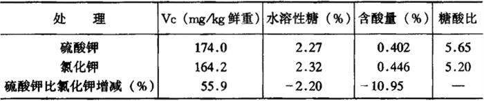 同样是钾肥,其肥料品种不同,作物的反应也不同。番茄需钾较大,为需氮量的1.5~2.0倍。随着氮、磷施肥水平的提高,增施钾肥对提高番茄产量、改善品质、减轻病害有明显的作用。前面讲过,施钾能提高番茄和西瓜的糖含量,降低酸含量,增加水果的糖酸比,硫酸钾与氯化钾相比,Vc提高6%,酸度降低11%,糖酸比提高0.45,番茄风味得到改善。天津市农业科学院土壤肥料研究所许前欣研究结果也表明,在改善番茄品质方面,硫酸钾优于氯化钾(表5-19、表5-20)。 表5-19 不同钾肥处理对番茄品质的影响