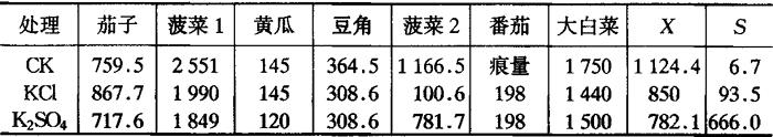 施钾能使蔬菜中硝酸盐含量降低,从表5-21可以看出,西瓜、菠菜、黄瓜、豆角、大白菜5种蔬菜试用钾肥后硝酸盐含量平均为816±675mg/kg,比对比降低308mg/kg,降低率为37.8%,其中硫酸钾降低782.1mg/kg,比氯化钾850mg/kg降低68mg/kg。 表5-21 钾肥对蔬菜中硝酸盐含量的影响(mg/kg)
