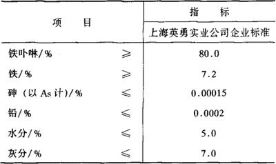 C34H36O4N4Fe 相对分子质量 620 性状 为深咖啡色粉末或结晶,无味。 制法 食用叶绿素经脱镁、脱植醇基,去异五环,芳构化制成游离卟啉,再经铁络合即成铁卟啉。 质量标准