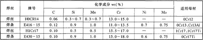 | 释义 | 铁素体不锈钢的焊材选择 焊接普通铁素体不锈钢,通常可以采用两种类型的填充材料。 (1)用与被焊钢材相同类型的焊接材料。如0Cr12,0Cr13,0Cr13A1等钢采用0Cr13Nb(AWS405Nb)的焊丝或焊条,0Cr17、0Cr17Ti钢使用1Cr17(Ti)的焊丝和焊条等。除以上Cr13和Cr17铁素体不锈钢,目前已有相应的同质焊材标准外,大部分高铬铁素体不锈钢均采用与母材同成分的焊材或自行研制的焊材,未列入标准。表2-4是两种手工焊材的化学成分。在要求焊缝金属与母材具有相同的导电、导磁及力学等物理性能和表面色泽时,应选同质的焊材。 表2-4 铁素体不锈钢焊材