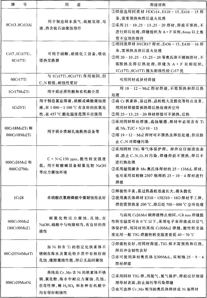 注:表中单值为最大值。 (2)采用奥氏体焊材甚至可以采用镍基合金的焊材,实际上是异种材料焊接,有利于提高焊接接头的塑韧性,可以免除焊前预热焊后热处理。不过不进行焊后热处理,不含稳定元素的铁素体不锈钢的HAZ的敏化和晶间腐蚀倾向将难以消除。 (3)高纯铁素体不锈钢的焊接工艺与焊接材料选择 对于碳、氮、氧等间隙元素含量极低的高纯铁素体不锈钢,高温引起的脆化并不显着,焊接接头具有很好的塑韧性,不需焊前预热和焊后热处理。在要求同种焊材焊接时,目前仍没有标准化的高纯铁素体不锈钢的焊接材料,一般采用与母材同成分的焊材作为填充材料,由于高纯铁素体不锈钢中的间隙元素含量已经极低,因此关键是在焊接过程中防止焊接接头区的污染,这是保证焊接接头的塑韧性和耐蚀性的关键。表2-5是铁素体不锈钢的用途及焊接材料选择。 表2-5 普通和高纯铁素体不锈钢使用和焊接材料选择