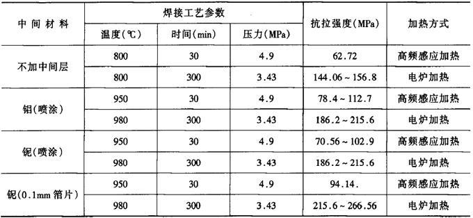 (三)铜与钛的扩散焊 铜与钛的扩散焊接有直接扩散焊接和加入中间过渡层的扩散焊接方法,前者接头强度低,后者强度高,并有一定塑性。钛与铜之间不加任何中间金属直接扩散焊时,为了避免和减少合金间化合物的生成,焊接过程只能在短时间内完成。TA2与铜的直接扩散焊的工艺参数是:焊接温度为850℃,焊接时间为10min,焊接压力为4.9MPa,真空度为133.322×10-4Pa。此温度虽略低于产生共晶体的温度,但这种接头的强度并不高,低于铜的强度。 在铜(T2)与钛(TC2)中间加入过渡金属层钼和铌,来阻止被焊金属间作用,使被焊金属间既不产生低熔点共晶,也不产生脆性的化合物相,焊接接头的质量会得到很大的提高。如以焊接温度为810±10℃,焊接时间为10min,真空度为133.322×10-2~5×133.322×10-4Pa,焊接压力为3.43~4.9MPa,进行过渡层扩散焊,接头力学性能见表2-6-47。 表2-6-47 TC2与T2、QCr0.8扩散焊工艺参数及接头力学性能[3]