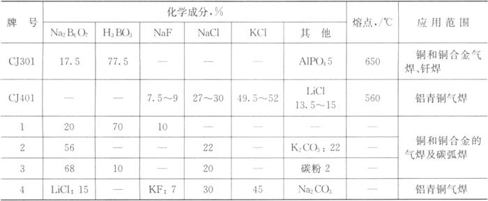 | 释义 | 铜及铜合金气焊熔剂 铜及铜合金气焊熔剂有粉末和气体熔剂两大类。粉末主要以硼砂、硼酸为基体,气焊含铝的铜合金时还加入氟化物和氯化物。表8.4-1为常用的粉末状铜及铜合金气焊熔剂。 表8.4-1 铜及铜合金气焊熔剂