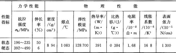 | 释义 | 铜及铜合金的分类、牌号及性能 目前常用的铜及铜合金有四种,分为纯铜(紫铜)、黄铜、青铜和白铜。纯铜的质量百分比不低于99.5%,具有极好的导电性、导热性、良好的常温和低温塑性,以及对大气、海水和某些化学药品的耐腐蚀性。纯铜的主要物理性能及力学性能见表7.10-1。 表7.10-1 纯铜的性能