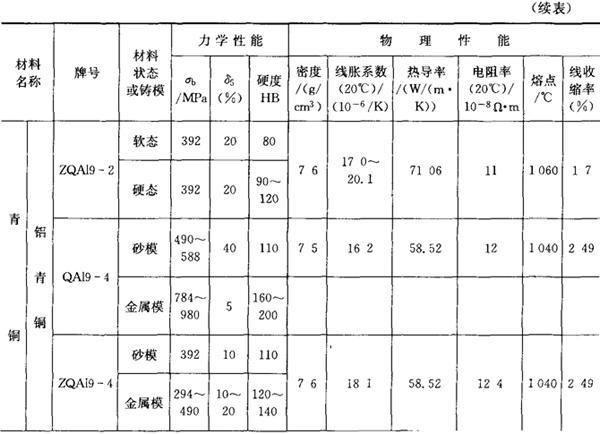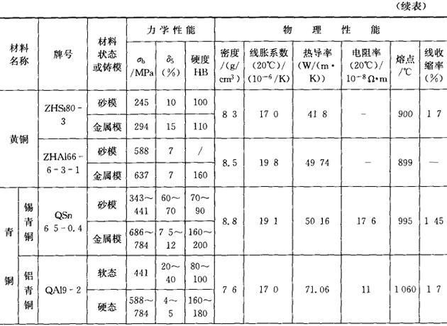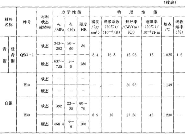 黄铜指由铜和锌为主要元素组成的合金,具有比纯铜高得多的强度、硬度和耐腐蚀能力,并保持一定的塑性,又能承受冷热加工。青铜是除铜-锌、铜-镍合金以外所有铜基合金的统称,如锡青铜、铝青铜、硅青铜和铍青铜等。白铜是铜和镍的合金,有较好的综合力学性能,高的耐腐蚀性能。 常用的铜合金性能见表7.10-2。 表7.10-2 常用铜合金的性能