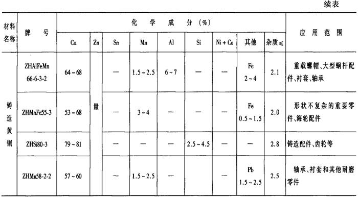 3.青铜 常用压力加工青铜和铸造青铜的化学成分和应用范围见表2-8-5,力学性能及物理性能见表2-8-6。 表2-8-5 常用青铜的化学成分及应用范围[2,3]