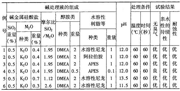 为解决这些问题,本专利建议使用摩尔比SiO2/M2O为2~5的碱金属硅酸盐及硅烷偶联剂等进行处理,但此法有发生臭气的问题。而本处理是对上述方法作了进一步改进。例1~9,将铝板脱脂后,用浸渍法进行磷酸铬酸处理,形成含铬150~200mg/m2的耐蚀性膜,再把此铝板在流动的水中洗清20秒。然后用下表所列的组成与pH值的碱处理液浸渍,再在200℃下干燥30分钟,使其表面形成亲水性膜。对此膜进行了亲水性持续试验及耐蚀性试验,结果也列于下表。