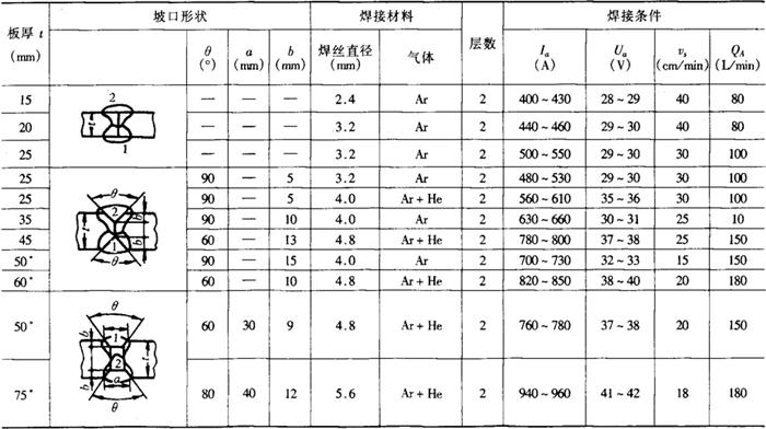 注:*Ar+He:内侧喷嘴50%Ar+50%He,外侧喷嘴100%Ar,喷嘴上倾5°。 Ia——焊接电流;Ua——电弧电压;v5——焊接速度;QA——气体流量。 |