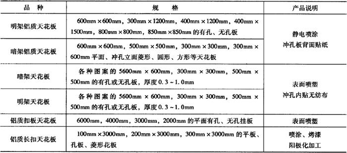图21-3 铝板天花的常用方板图案 表21-20 铝板天花的规格及品种