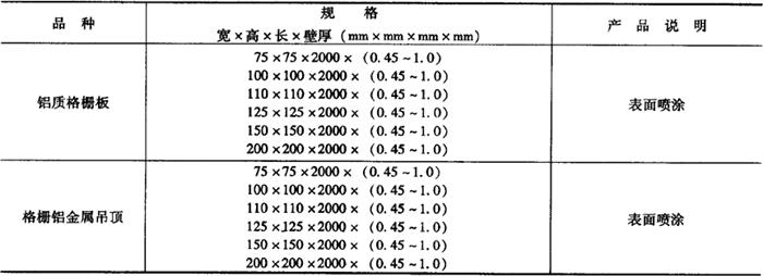 (三)铝质格栅天花 铝质格栅天花是主龙骨、副龙骨纵横分布,把天花装饰板面分割成若干个小格,使原天花面的视觉发生改变,起掩饰作用的一种顶棚装饰材料。 1.铝质格栅天花的特点 铝质格栅装饰的天花,无论从远近、高低不同的角度,均能显示出不同的视觉效果,使天花装饰面显得更加美观、活跃、宽阔。这种天花具有防火、耐潮、拆装方便、不反光、透光、通风好等优良性能,而且冷风口、排气口、音响、灯具等均可装在天花内,使天花具有极强的整体性。 2.铝质格栅天花的用途 铝质格栅天花是一种很好的顶棚装饰材料,主要适用于机场、车站、地铁车站、商场、娱乐场所、超市、高级停车场等场所,这种天花能充分利用天花板上的空间使空气充分流通,使室内保持空气新鲜。 铝质格栅天花的规格及品种,如表21-21所示。 表21-21 铝质格栅天花的规格及品种
