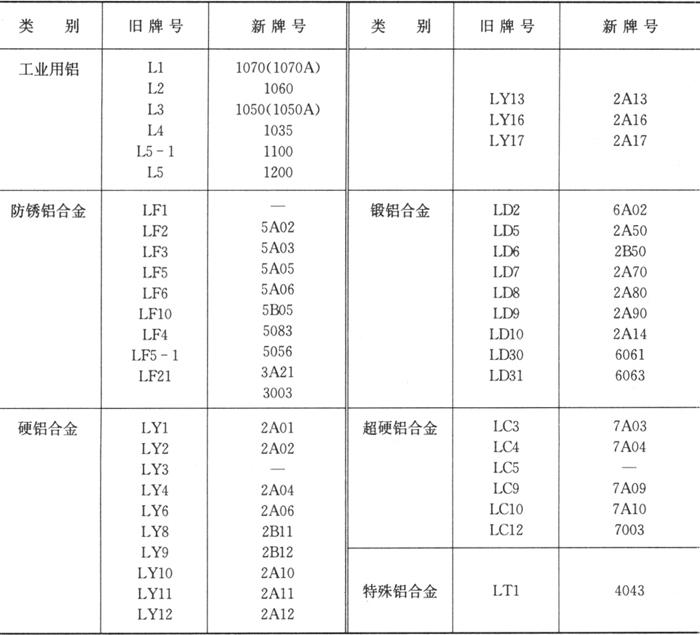 由于目前使用中还习惯于采用原牌号,故在表9.1-4中列出了变形铝和铝合金的新旧牌号对照。请读者注意的是大多数牌号的化学成分是相同的,但也有部分牌号的化学成分相近似,并不完全等同。