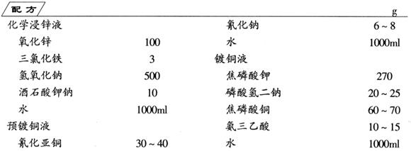制法 (1)化学浸锌液的制备 按配方量要求将氢氧化钠溶于500ml水中,不断搅拌至全部溶解后,加入氧化锌,加热至全溶。将三氯化铁和酒石酸钾钠溶于少量水中,待溶解后加入上述溶液中,并加足水量。 (2)预镀铜液的制备 先将氰化钠溶于水中,加入氰化亚铜使其溶解,再加足水至1000ml。 (3)镀铜液的制备 将焦磷酸铜用少量水溶解调成糊状,再与用少量水溶解的焦磷酸钾相混合,不断搅拌使其全部溶解。再加入氨三乙酸和磷酸氢二钠,并加足1000ml水量,搅拌,混合,溶解,即得成品。 使用方法:首先将铝材表面擦干净,并要用20%~30%氢氧化钠溶液浸泡去油5~10min,取出后用清水冲净,再用60%~70%硝酸溶液浸泡漂白2~3min,用清水冲洗干净后浸入浸锌液中,取出擦净,再重复浸泡一次即可。然后把经两次浸锌液浸泡的铝材,在40~50℃下以2~3A/dm2的电流密度进行预镀2~4min。取出用清水冲洗干净后,于35~45℃下以0.5~0.8A/dm2的电流密度镀铜至所需厚度即可。铜镀液的pH值应控制在8~9之间。 |