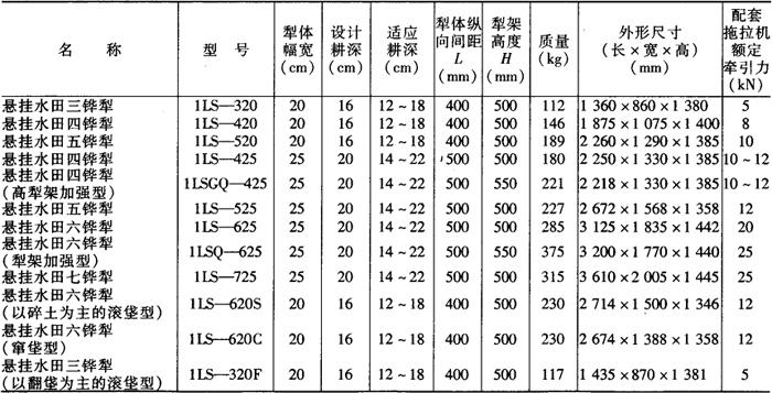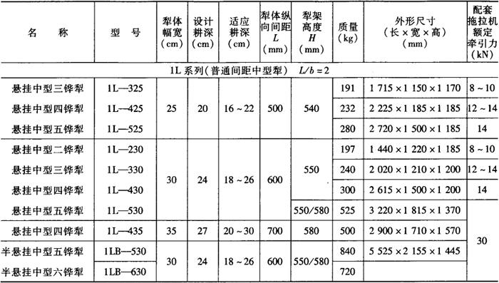 注:型号含义:1——耕耘整地机械,L——犁,S——水田型,G——高犁柱变型,Q——犁架加强型。三位数:第一个数字为犁体数,第二、三个数字为单体幅宽。S——碎土型,F——翻土型,C——窜垡型,数字后无字母的为通用型。 表5-2 旱田铧式犁系列主要机型及技术规格