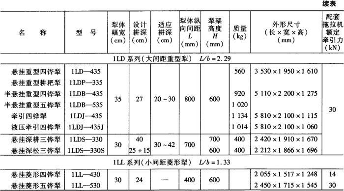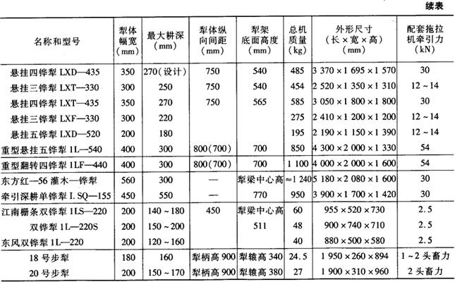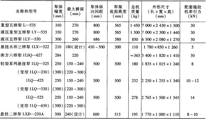 注:型号含义:1——耕耘整地机械,L——犁,B——半悬挂,D——大间距,P——耕耙犁,J——牵引式,S——深耕犁,L——菱形犁。 表5-3 部分非系列铧式犁主要技术参数