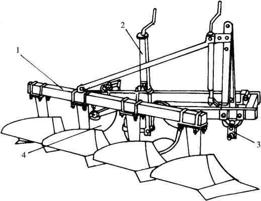 (二)铧式犁的一般构造 铧式犁一般由工作部件和辅助部件组成。牵引犁和悬挂犁的工作部件基本相同,它们是主犁体、小前犁、圆犁刀等。牵引犁的辅助部件是犁架、犁轮、起落机构、调节机构、牵引装置等。悬挂犁(图5-5)因悬挂在拖拉机的悬挂装置上,因此省去了起落机构和牵引装置,而增加一个悬挂装置。