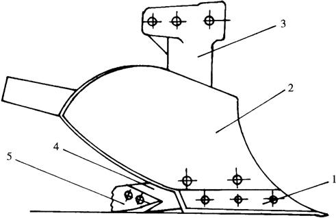 图5-6 主犁体 1.犁铧 2.犁壁 3.犁柱 4.犁侧板 5.犁踵 犁铧的作用是入土和切土,并使土垡向上推移到犁壁。犁铧工作时承受阻力较大,比较容易磨损,磨钝后的犁铧工作阻力和拖拉机的耗油显着增加,犁的入土性能变坏,耕深变浅。所以耕地时应保证犁铧刃口锋利,磨钝后及时更换新铧,并将可以修复的旧铧修复后备用。犁壁的作用是破碎和翻转土垡。犁铧和犁壁组成犁体曲面,犁体曲面的左边刃称为犁胫,起垂直切开土壤的作用;中部为犁胸,主要起碎土作用;后部称犁翼,主要起翻土作用。犁侧板的作用是抵抗犁在工作时的侧压力,使犁工作稳定,直线前进。在多铧犁上最后边犁体的犁侧板因承受侧压力最大,故最后犁体的犁侧板最长,有的在其末端还装有犁踵,磨损后可以向下调节,严重时可更换。犁柱的作用是把犁铧、犁壁、犁侧板等固定在一起,并通过犁柱与犁架连结。 (2)小前犁:为了提高主犁体的翻垡覆盖质量,将小前犁配置在主犁体前方犁胫一侧,将靠近地边的土垡上层部分土壤、杂草和肥料等翻到沟底,使主犁体翻垡、覆盖更为彻底。 小前犁主要有3种类型:铧式小前犁、切角式小前犁和圆盘式小前犁(图5-7),其中以铧式小前犁应用最为普遍。