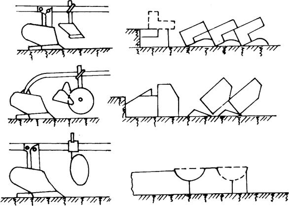 图5-7 各种小前犁的翻垡过程 (3)圆犁刀:圆犁刀一般装在最后一个主犁体的前面,耕地时先将土垡垂直切开,保持沟壁整齐,沟底干净,以利于下一趟耕作。 2.铧式犁的辅助部件 铧式犁的辅助部件包括犁架、犁轮、起落和调节机构、牵引装置和悬挂装置等。 (1)犁架:犁架是连接犁的各部分成一整体的骨架,并传递牵引力。 (2)犁轮:犁轮的作用是支持犁的重量,限制犁的耕深,便于牵引犁的运输。一般牵引犁有3个犁轮:地轮、沟轮、尾轮。地轮工作时走在未耕地上,沟轮工作时走在犁沟里,尾轮工作时走在最后犁体的犁沟,并承担犁在耕地时所产生的侧压力,使犁直线行驶,运输时尾轮可在一定范围内转动,以利于转向。悬挂犁只有一个限深轮,改变限深轮的位置即可调节耕深。 (3)起落和调节机构:起落机构用于变换牵引犁的工作位置和运输位置。牵引犁的耕深调节机构用以调节犁的耕深,水平调节机构用以调节犁架的横向水平,尾轮调节机构用以调节尾轮在工作时的上下及左右位置使各犁体耕深一致,工作稳定。悬挂犁的调节机构有深浅调节,犁的横向、纵向和水平调节,耕宽调节用以调节前犁体的耕宽,正位调节机构用以调节犁架纵梁与犁的行进方一致。 (4)牵引装置:牵引装置是牵引犁与拖拉机连接的部件,可以在犁架上调节其上下及左右位置,以达到正确牵引的目的。 (5)悬挂装置:悬挂装置是悬挂犁与拖拉机连接的部件,由悬挂架和悬挂轴组成,悬挂轴固定在犁架上,可以左右移动调节前犁体的正确耕宽。改变悬挂轴一端的前后位置用于正位调节。 |