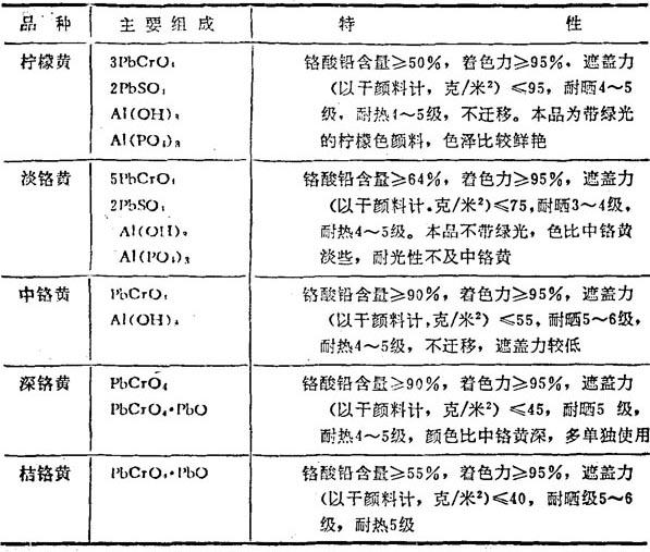 性质与用途 铬黄是铬酸铅或碱性铬酸铅与硫酸铅等不溶性盐的混合晶体。相对密度6.0~6.6。平均粒径0.2~1微米。颜色随成分而异,从淡黄色到橙色,通常将其分成柠檬黄、淡铬黄、中铬黄、深铬黄和桔铬黄五种。表14-1为各品种的组成与特性。铬黄为不透明无机颜料,可作为塑料用黄色着色剂,着色力和遮蔽力强,耐水性和耐溶剂性优良,但耐碱性差,耐光性和耐热性中等。多用于聚氯乙烯、聚苯乙烯、丙烯酸树脂等热塑性塑料,也可用于酚醛树脂、环氧树脂、氨基树脂、不饱和聚酯等热固性塑料,但色泽发暗。本品遇硫化物有变黑趋势,应避免与含硫着色剂并用。