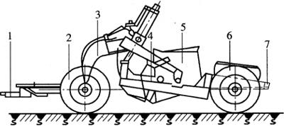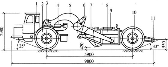 图1-13 CL7型自行式铲运机 1-驾驶室;2-前轮;3-中央框架;4-转向油缸;5-辕架;6-提斗油缸;7-斗门;8-铲斗;9-斗门油缸;10-后轮;11-尾架 铲运机的工作装置是一个刚性铲斗,铲斗的前方有一个能开启的斗门,铲斗前设有切土刀片。在进行切土作业时,铲斗的斗门打开,铲斗下降,使刀片逐渐切入土中。在铲运机前进时,被切下的土挤入铲斗内;铲斗装满土后,可提起铲斗,同时放下斗门,将土运至卸土地点。铲运机能够独立完成铲土、运土、卸土、填筑、整平和压实等多项工作,具有对行驶道路要求低、行驶速度快、操纵比较灵活、生产效率高、运转费用低、易于控制运行路线等特点。