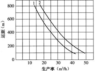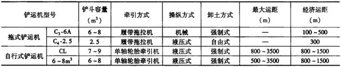 图1-15 铲运机运距与生产率的关系 1-6m3铲运机;2-10m3铲运机 表1-9 各种铲运机的适用范围