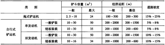 图1-14 G6-2.5型拖式铲运机 1-拖把;2-前轮;3-辕架;4-斗门;5-铲斗;6-后轮;7-尾架 铲运机适用于大面积场地平整,中距离土方转移工程,开挖大型基坑、沟槽及填筑路基、堤坝等工程,主要用于四类以上的土。当铲运机铲运三、四类较坚硬的土壤时,宜采用松土机配合施工,以便加快施工进度,提高经济效益。 铲运机的运距和铲斗容量大小,对其生产率有显着的影响(图1-15),其经济运距视机械类型不同而异,一般与铲斗容量的大小成正比(表1-9和表1-10)。但表中的数据也不是绝对的。在一般情况下,当铲斗容量小于6m3时,铲运机的最短距离以不小于100m,最长不应超过350m,经济运距以200~300m为宜。对于铲斗容量大于10~30m3的自行式铲运机,最短运距不小于800m,最长距离可达1500m以上。
