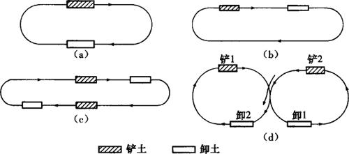 图1-16 铲运机运行路线 (a)环形路线;(b)环形路线;(c)大环形路线;(d)“8”字形路线 (一)环形路线 对于地形起伏不大,而施工地段比较短(50~100m)和填方高度较小(0.1~1.5m)的路堤、基坑及场地平整工程,宜采用如图1-16a、b所示的环形路线。这种环形运行路线每一个循环只完成一次铲土和卸土,可以使挖土和填土交替。 (二)大环形路线 当挖、填交替,且相互间的间距又不大时,可采用如图1-16c所示的大环形路线。这种大环形运行路线每一个循环可以完成两次或多次铲卸作业,减少了铲运机的转弯次数,从而提高了工作效率。但每隔一定时间要变换铲运机的运行方向,防止单侧受力磨损。 (三)“8”字形路线 在地形起伏较大,施工地段狭长的情况下,宜采用“8”字形路线,如图1-16d所示。这种“8”字形运行路线,铲运机上坡和下坡时是斜向行驶,所以坡度比较平缓,在一个循环中两次转弯方向不同,机械磨损比较均匀;同时在一个循环中可完成两次铲土和卸土,减少了转弯次数及空车行驶距离,可以缩短运行时间、提高生产效率。 |