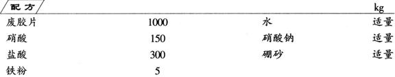 制法 (1)溶解银层 将X光废胶片、电影废胶片和照相废胶片用6%~8%的稀硝酸浸泡24h左右,溶解胶片上的银层。 (2)沉淀氯化银 加入体积比为1%的16%盐酸,生成白色氯化银沉淀。静置澄清,抽滤,用水洗涤沉淀直至中性。 (3)还原出银粉 将等量的纯铁粉和氯化银沉淀混合,加入体积比为1%的16%盐酸,8~12h后,生成灰褐色的银粉。用水洗涤直至无酸性。低温烘干。 (4)熔铸银锭 在烘干的银粉中加入少量硝酸钠和硼砂,在1000~1200℃时熔炼,去除其他金属氯化物和杂质,最后铸模成银锭,纯度可达98%。 每吨各种废胶片可回收金属银0.20~0.45kg。 |