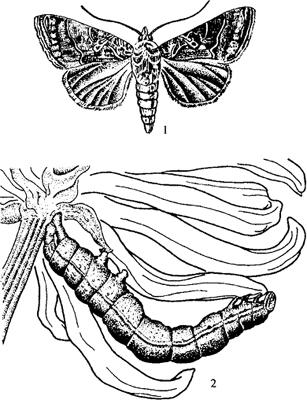 图5-13 银纹夜蛾 1.成虫 2.幼虫 【生活习性】 1年发生4~5代。以蛹越冬。翌年4月中可见成虫羽化。成虫羽化后经4~5天进入产卵盛期。卵多散产于叶背。第二至三代产卵最多,平均每雌产卵311.2粒,最多可产756粒。幼虫3龄前在叶背取食,留下表皮,进入4龄食量大增。幼虫共5龄。在25.5℃下1龄平均2.4天,2龄平均2.2天,3龄2天,4龄1.8天,5龄1.9天,共12.3天。老熟幼虫在叶背吐白丝结薄茧化蛹。11月底12月初仍可见到羽化成虫。 【防治方法】 (1)冬季结合清园,集中处理残茬、老叶上越冬蛹,减少来年虫口基数。 (2)黑光灯诱杀成虫。 (3)在幼虫盛孵时,喷青虫菌100亿孢子/毫升500倍液,或喷50%马拉硫磷乳油1000倍液,或20%杀灭菊酯2000倍液。 |