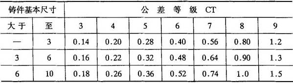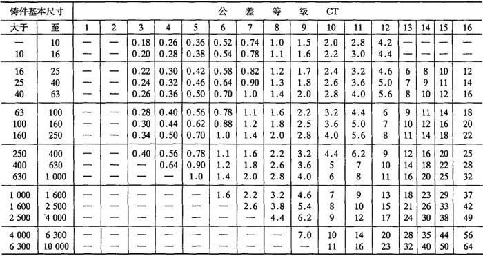 注:1.没有规定CT1和CT2级的公差值,是为将来可能要求更精密的公差保留的. 2.表中CT13~CT16级小于16mm的铸件基本尺寸,其公差值需单独标注,可提高2、3级. 3.表中数据适用于砂型铸造、金属型铸造、低压铸造、压力铸造和熔模铸造等铸造工艺方法生产的各种铸造金属及合金铸件. 成批和大量生产公差等级见表2-21.对于成批和大量生产的铸件,可以通过对设备和工装的改进、调整和维修,严格控制型芯位置,获得比表2-21所列更高的等级. 表2-18 铸件尺寸公差数值(二) mm