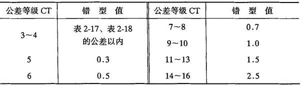 注:表中公差值仅适用于各种铸造金属及合金的压铸件和熔模铸件小于10mm的铸件基本尺寸. 表2-19 错型值 mm
