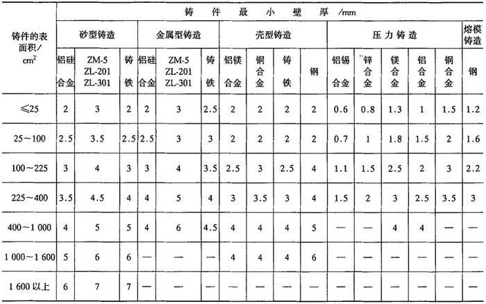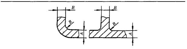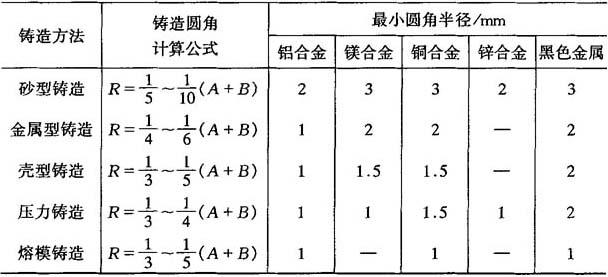 5.圆角半径 铸件壁部连接处的内转角应有铸造圆角,其计算公式及所允许的最小半径数值见表2-35.计算时热裂性较大的合金圆角半径取较大值. 表2-35 铸造圆角