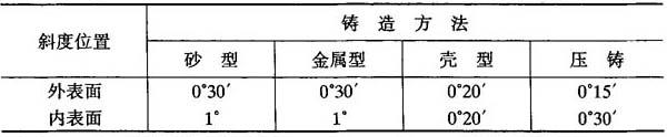 图2-1 铸造斜度的形式 (a)以壁的下端为基点;(b)以壁的中部为基点;(c)以壁的上端为基点 铸件上各面斜度的数值应尽可能一致,以便于制造模具和造型.待加工表面的斜度数值可以大一些.对于砂型及硬型铸件斜度常选用3°,压铸件常选用1°30′~2°.对于非加工表面,斜度值可适当减校一般参照表2-34所列数据确定. 表2-34 各种铸造方法的最小铸造斜度