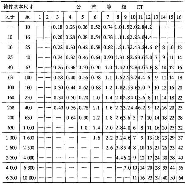 注:1.CT1和CT2没有规定公差值,是为将来可能要求更精密的公差保留的. 2.CT13至CT16小于或等于16mm的铸件基本尺寸,其公差值需单独标注,可提高2~3级. 表5-118 部分铸件尺寸公差数值(GB6414—86) mm