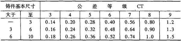 注:1.铸件基本尺寸小于或等于10mm时,其公差等级提高3级. 2.铸件基本尺寸大于10至等于16mm时,其公差等级提高2级. 3.铸件基本尺寸大于16至等于25mm时,其公差等级提高1级. 4.表5-119、表5-120中的公差等级适用于大于25mm的基本尺寸铸件公差分等应符合表5-121的规定. 表5-121 铸件公差分等(JB/JQ82001—90)