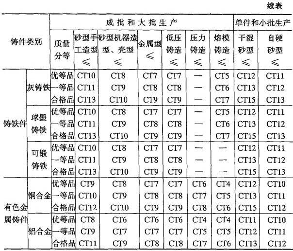 表5-119 成批和大量生产铸件的尺寸公差等级(GB6414—86)