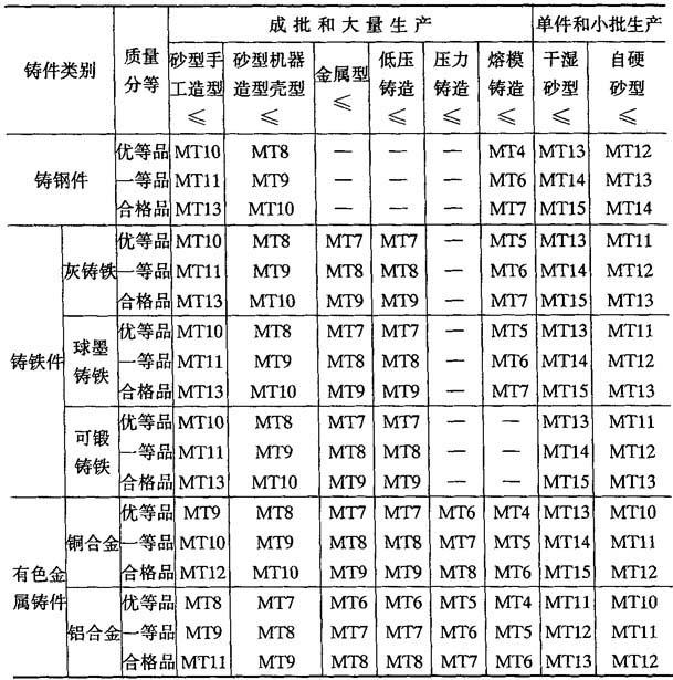 表5-123 用于成批和大量生产的铸件质量公差等级(GB/T11351—89)