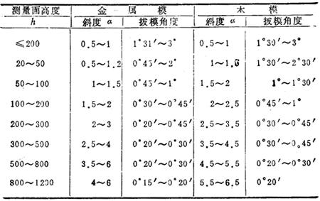 表14-72 铸件摸样的拔模率(α/h)(mm)