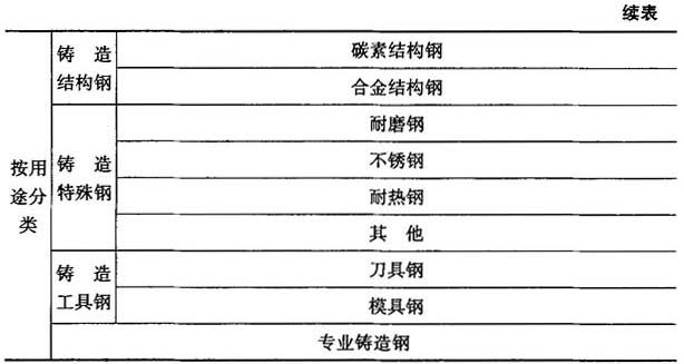 | 释义 | 铸钢 钢的种类很多,铸造生产时只用到其中的一部分.作为铸造材料的钢主要有铸造碳钢、铸造低合金钢的铸造高合金钢.其中有些钢种(例如高锰钢和高铬钢)由于本身性能的特点,不可能用轧制或锻压的方法加工,只能作为铸造材料.铸钢的分类见表4-4. 表4-4 铸钢分类